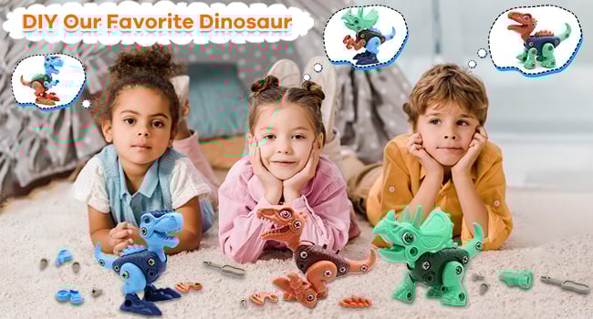 【Newest Take Apart Dinosaur Toys】Our kids toys for boys & girls include 3 kinds of dinosaurs: brown Tyrannosaurus Rex, red Triceratops, green Velociraptor. Kids can open this dinosaur Kit box and start playing immediately. The multi-color design helps attract children's attention to creative assembly and promotes children's teamwork.