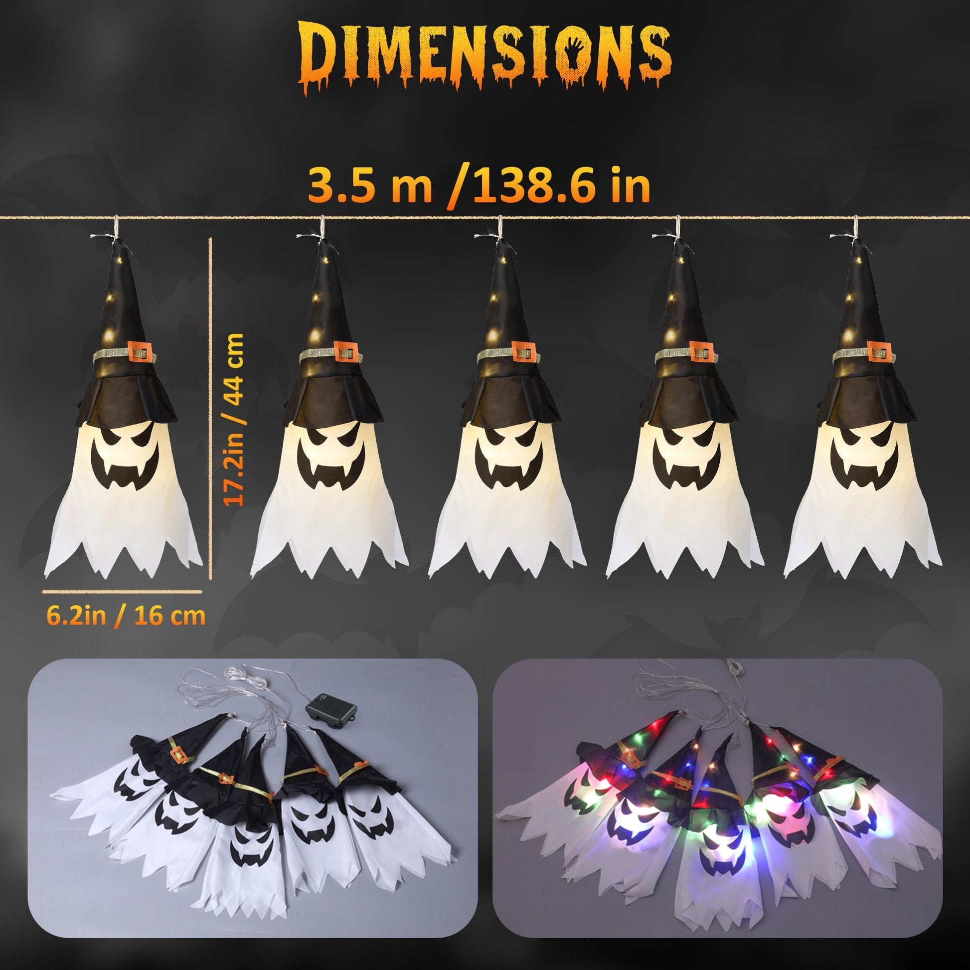 - UNIQUE HALLOWEEN DECORATION: The unique ghost wizard hat combines perfectly with the colorful string lights, and the double-sided grimace print creates more of a Halloween vibe under the twinkling lights.The Halloween decorations include 5 PCS ghost witch hats,when night falls, they will seem to float in the air, creating a mysterious atmosphere.and give your neighbors and friends a distinctive look and feel