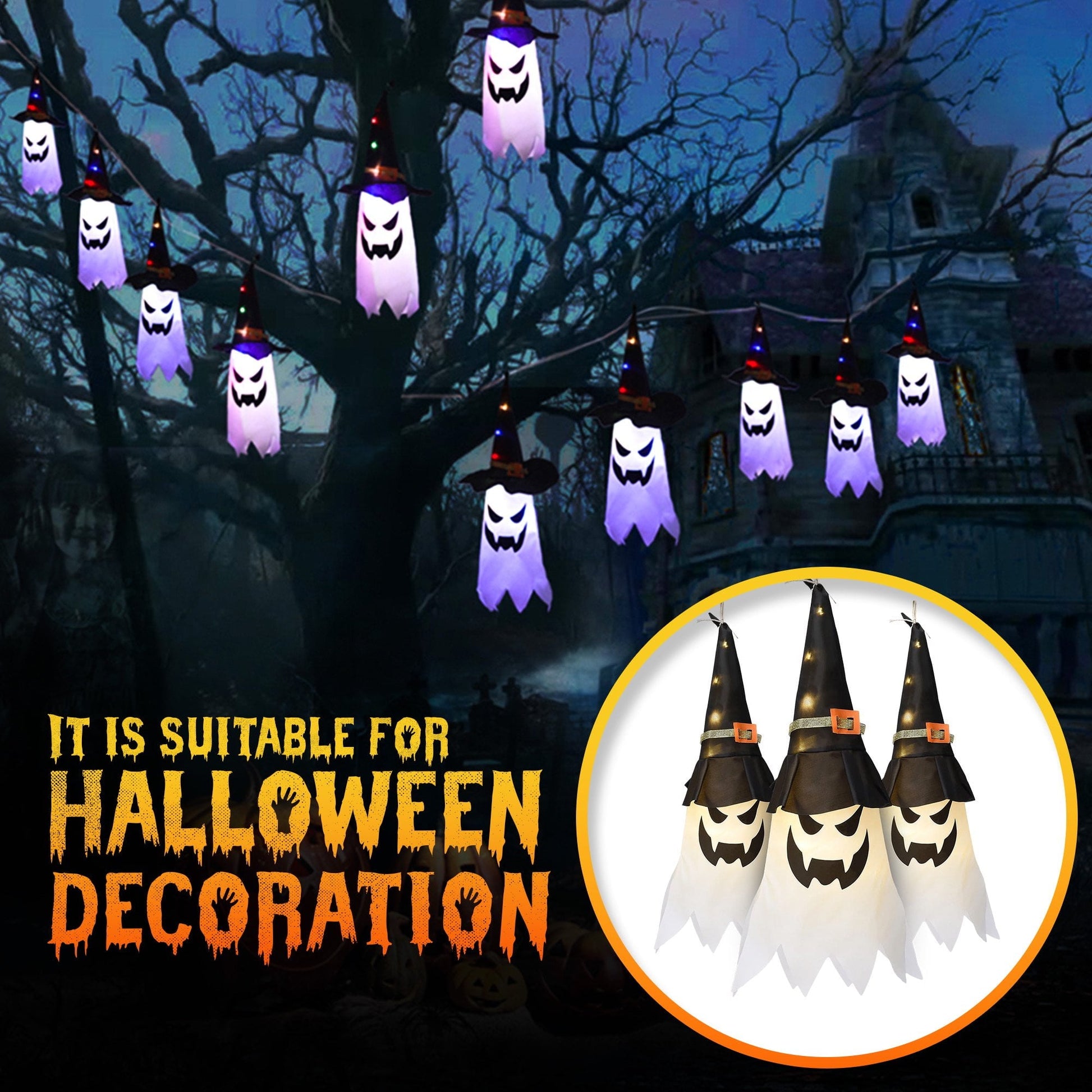 - COLORFUL LED HALLOWEEN LIGHTS: Each Halloween hanging decorations has Energy-saving 50LEDs lights make it more durable and longer-lasting.When in use, just turn on the switch of the battery box to turn on the constant light mode. Each Glowing Ghost Witch Hat has a flashing string of lights, light up your entire outdoor Halloween decoration