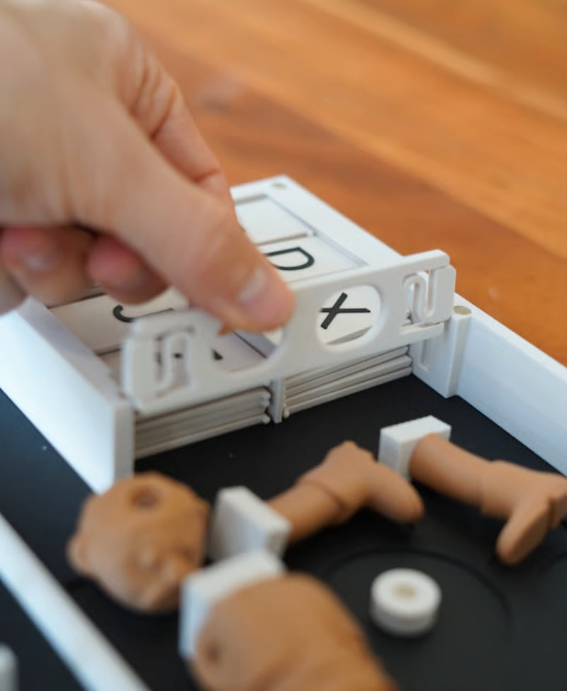 Executioner: Pick a word up to 7 letters long. Place the letter into the slots, they will click in. The first letter of the word goes into the rightmost slot.