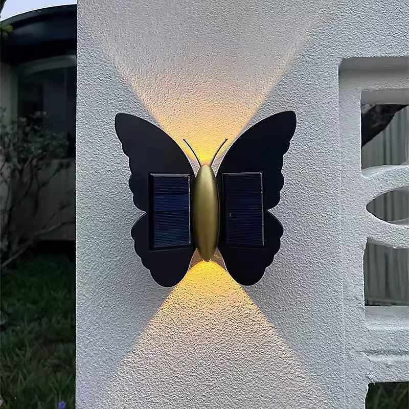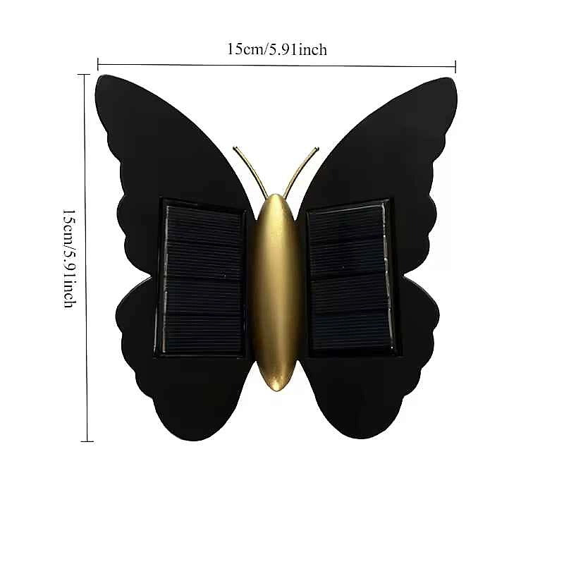 Add Charm to Your Garden with Solar Butterfly Wall Lights This warm light LED solar wall lamp features a butterfly design, perfect for decorating fences, balconies, courtyards, and garden paths. Powered by a 2V solar panel with a built-in 1000mAh battery, it charges in 6+ hours and provides 6–8 hours of light. IP44 waterproof and built with durable materials, it’s ideal for year-round outdoor use. Specifications: Light Color: Warm White Size: 150×150×65mm LED: 2×2835 SMD Battery: 1.2V AA Ni-MH 1000mAh (included) Solar Panel: 2V/250mA Modes: ON / OFF / Auto Charging Time: 6+ hours (sunlight) Working Time: 6–8 hours Waterproof: IP44 Use: Garden, pathway, fence, balcony, yard décor
