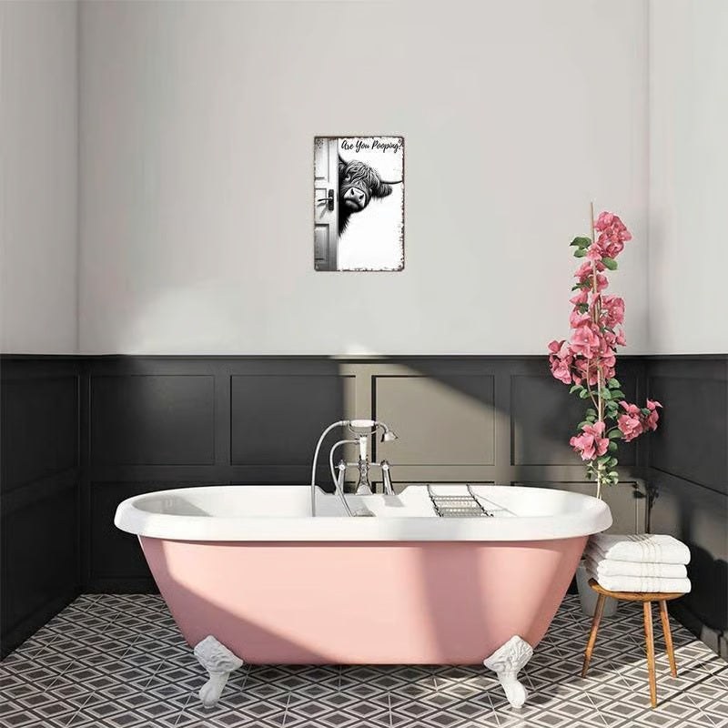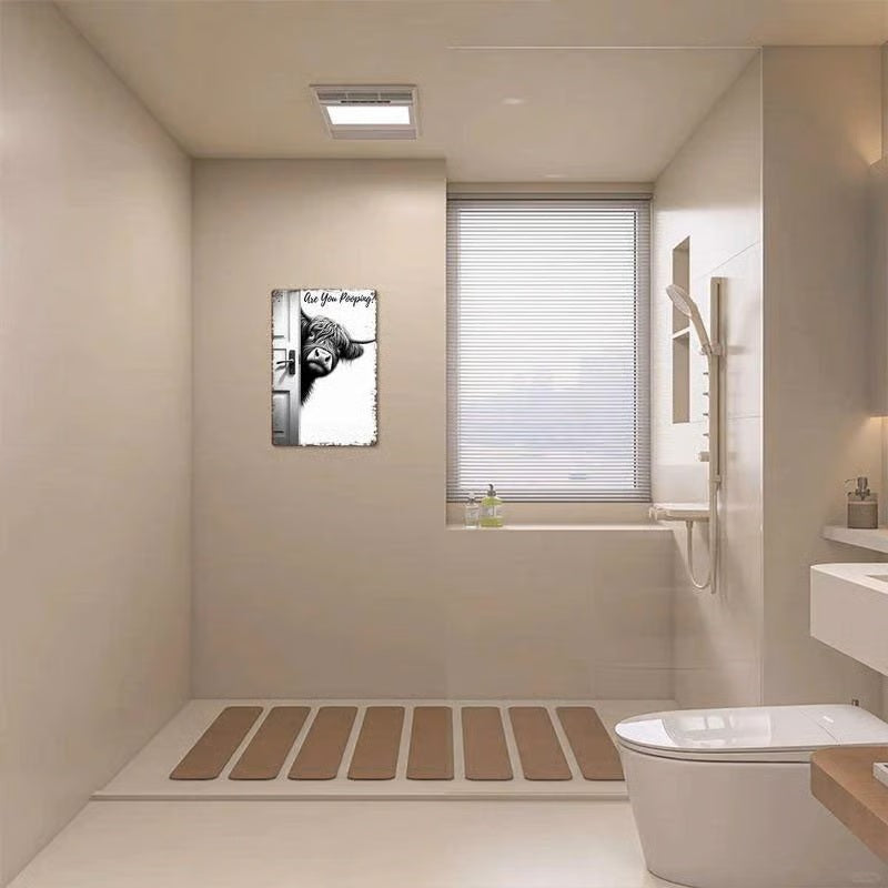 "Knock, knock! Who's there?" It’s your new favorite bathroom companion! Add a heavy dose of laughter to your daily routine with this witty piece of wall art. Featuring a curious Highland cow peeking around a door frame, this sign asks the bold question everyone else is too polite to ask. It is the perfect mix of rustic charm and comedy that guarantees a smile from every guest.